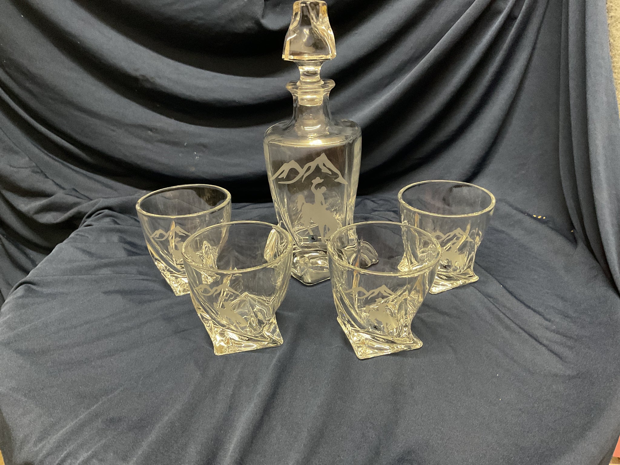 The Steamboat Twisted Crystal Decanter Set pays tribute to Wyoming’s iconic Steamboat horse, featuring a finely crafted decanter inspired by this legendary symbol. Alongside the decanter, four matching crystal glasses complete the sophisticated set. Each piece showcases a twisted crystal design that enhances the clarity and presentation of your favorite spirits while embodying the heritage and elegance of the American West. Ideal for collectors and enthusiasts who value both craftsmanship and cultural significance.